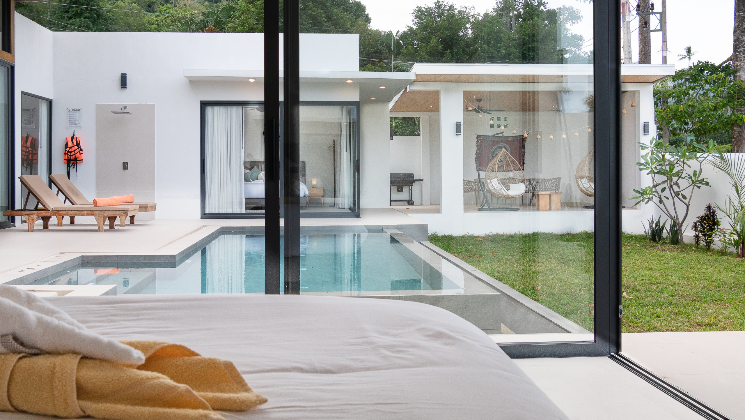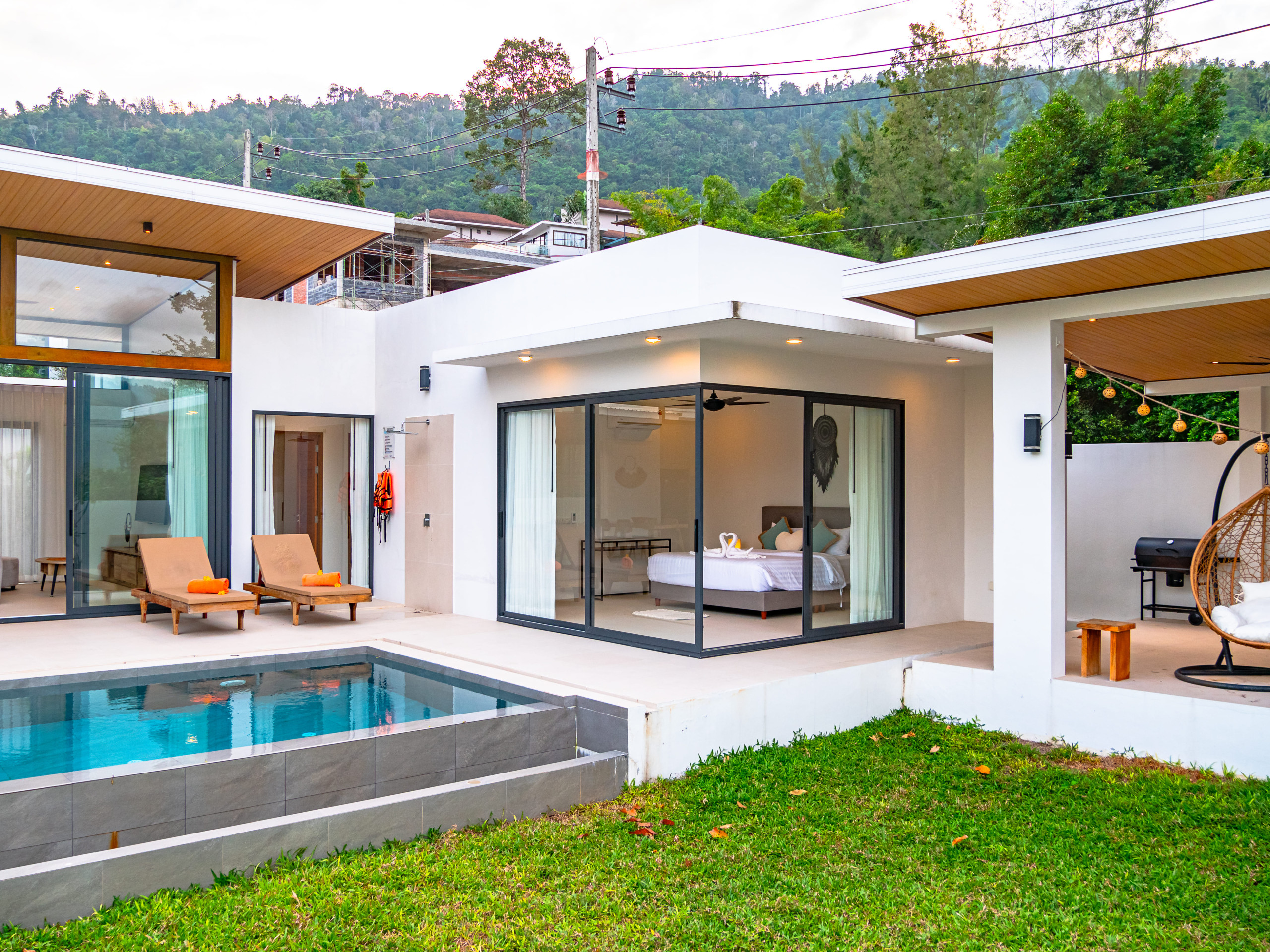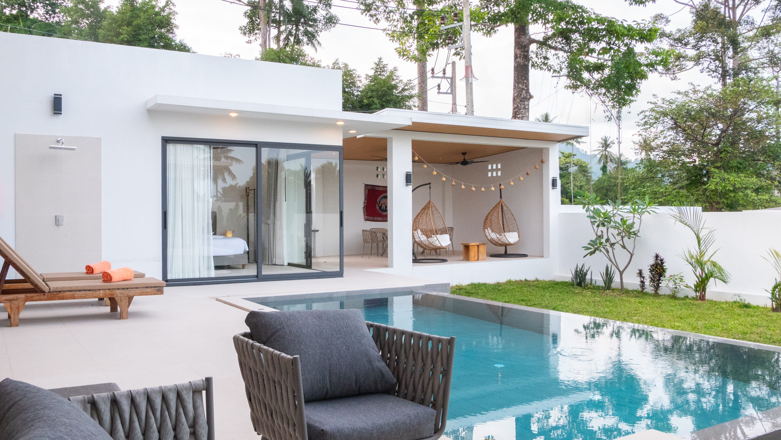 Villa à Ko Samui qui possède 3 chambre(s) et Capacité pour 6 personnes. Logement de 400 m². Elle dispose de jardin, mobilier de jardin, clôture, 100 m² de terrasse, barbecue, coffre-fort, accès internet (wifi), sèche-cheveux, balcon, climatisation, piscine privée, parking couvert même bâtiment, 5 ventilateurs, 1 Télévision. La cuisine américaine, à induction, est équipée avec réfrigérateur, micro-ondes, four, congélateur, lave-vaisselle, vaisselle/couverts, ustensiles/cuisine, cafetière et bouilloire.