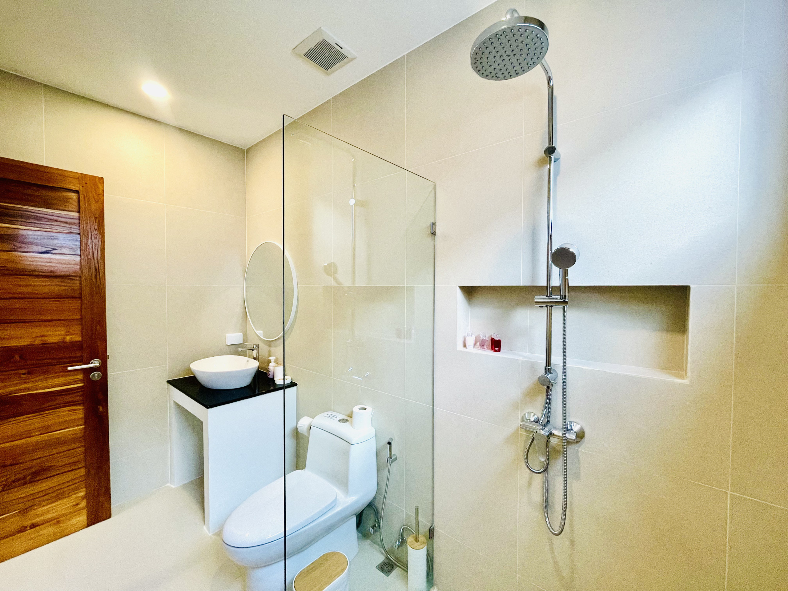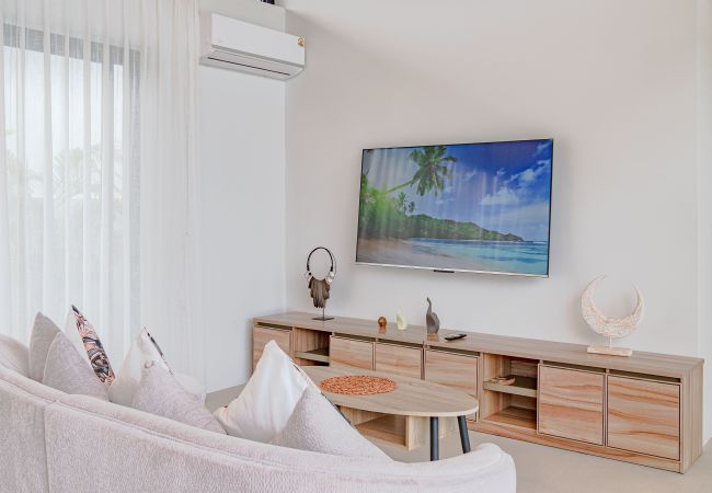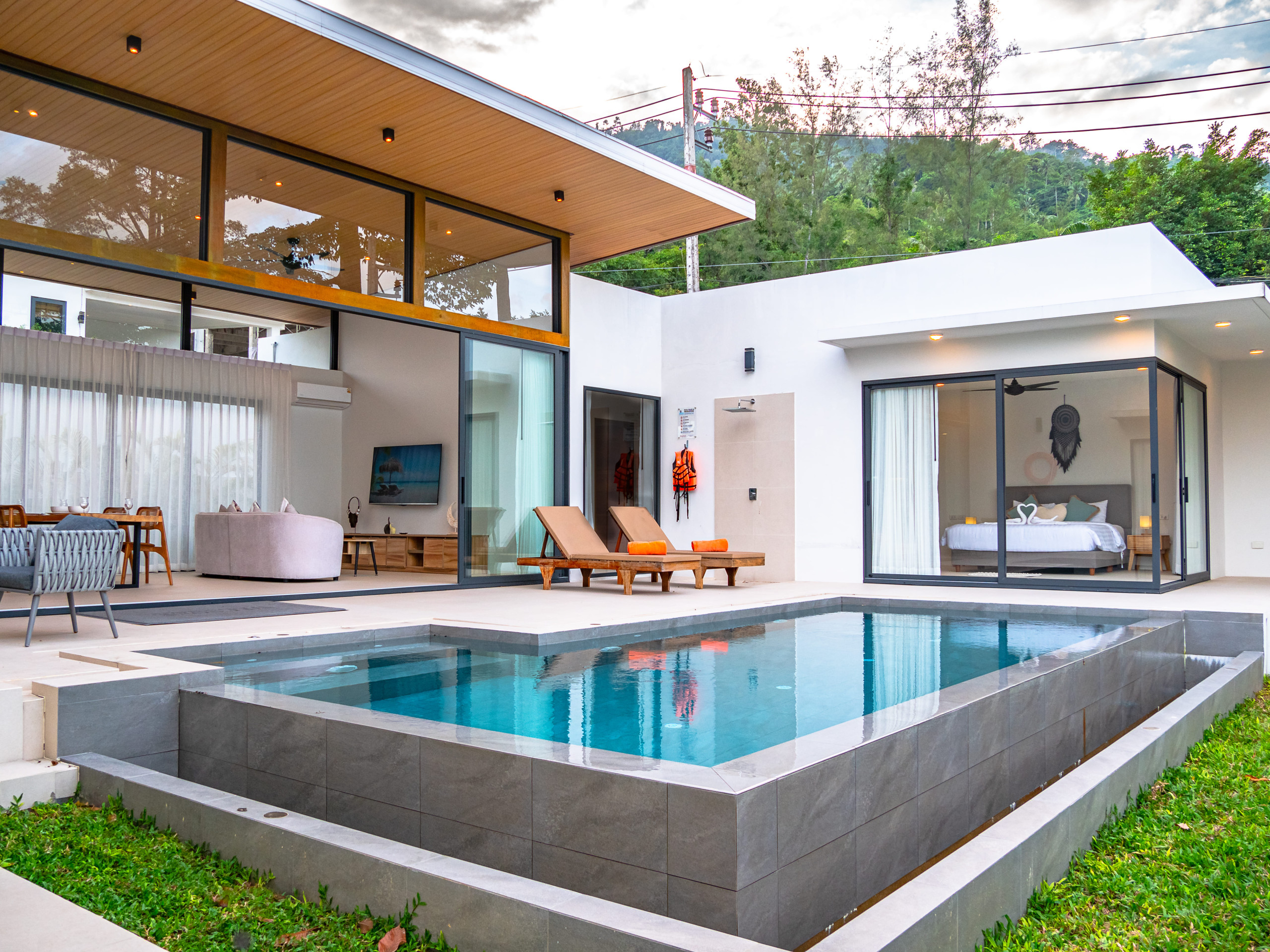 Villa à Ko Samui qui possède 3 chambre(s) et Capacité pour 6 personnes. Logement de 400 m². Elle dispose de jardin, mobilier de jardin, clôture, 100 m² de terrasse, barbecue, coffre-fort, accès internet (wifi), sèche-cheveux, balcon, climatisation, piscine privée, parking couvert même bâtiment, 5 ventilateurs, 1 Télévision. La cuisine américaine, à induction, est équipée avec réfrigérateur, micro-ondes, four, congélateur, lave-vaisselle, vaisselle/couverts, ustensiles/cuisine, cafetière et bouilloire.