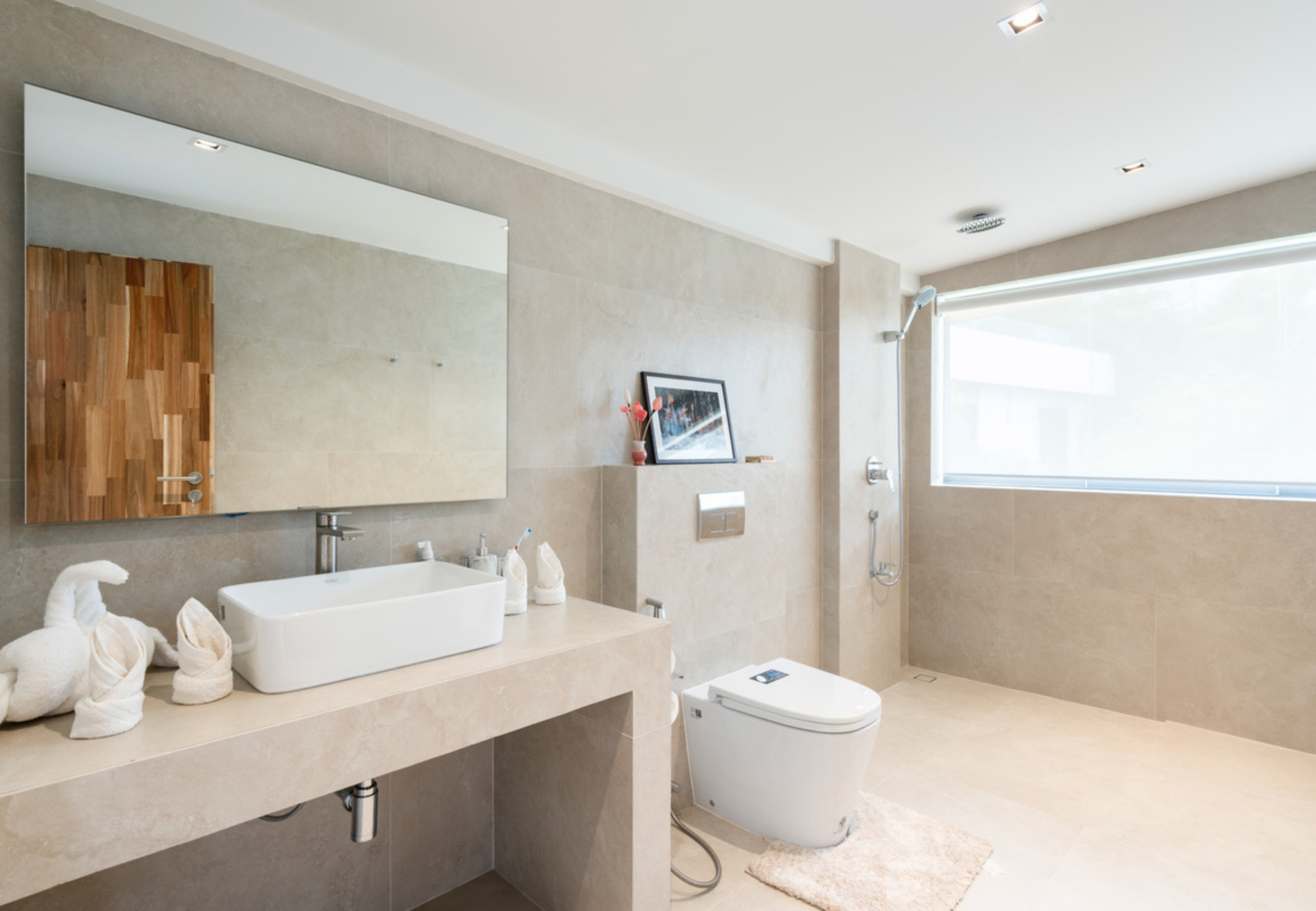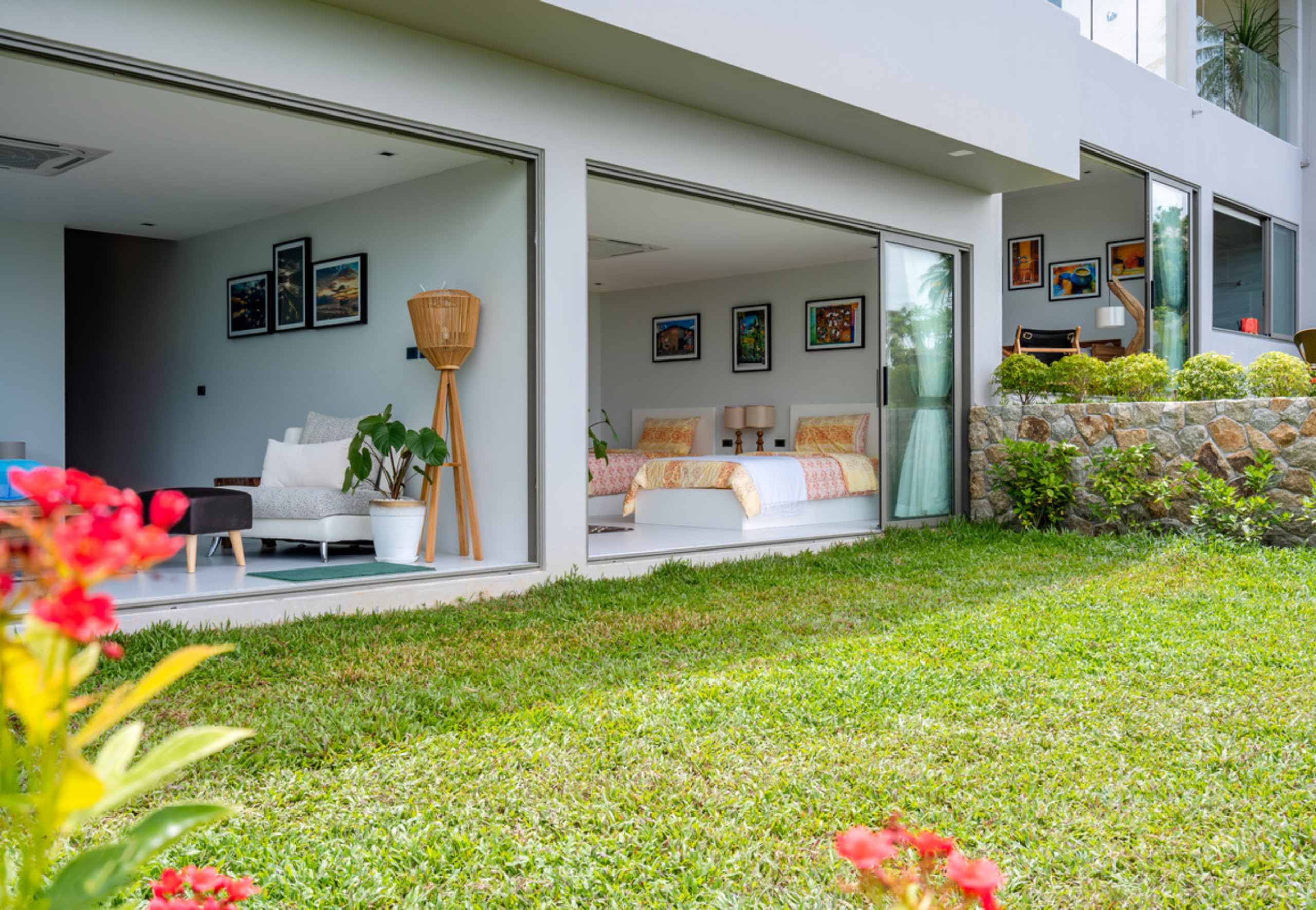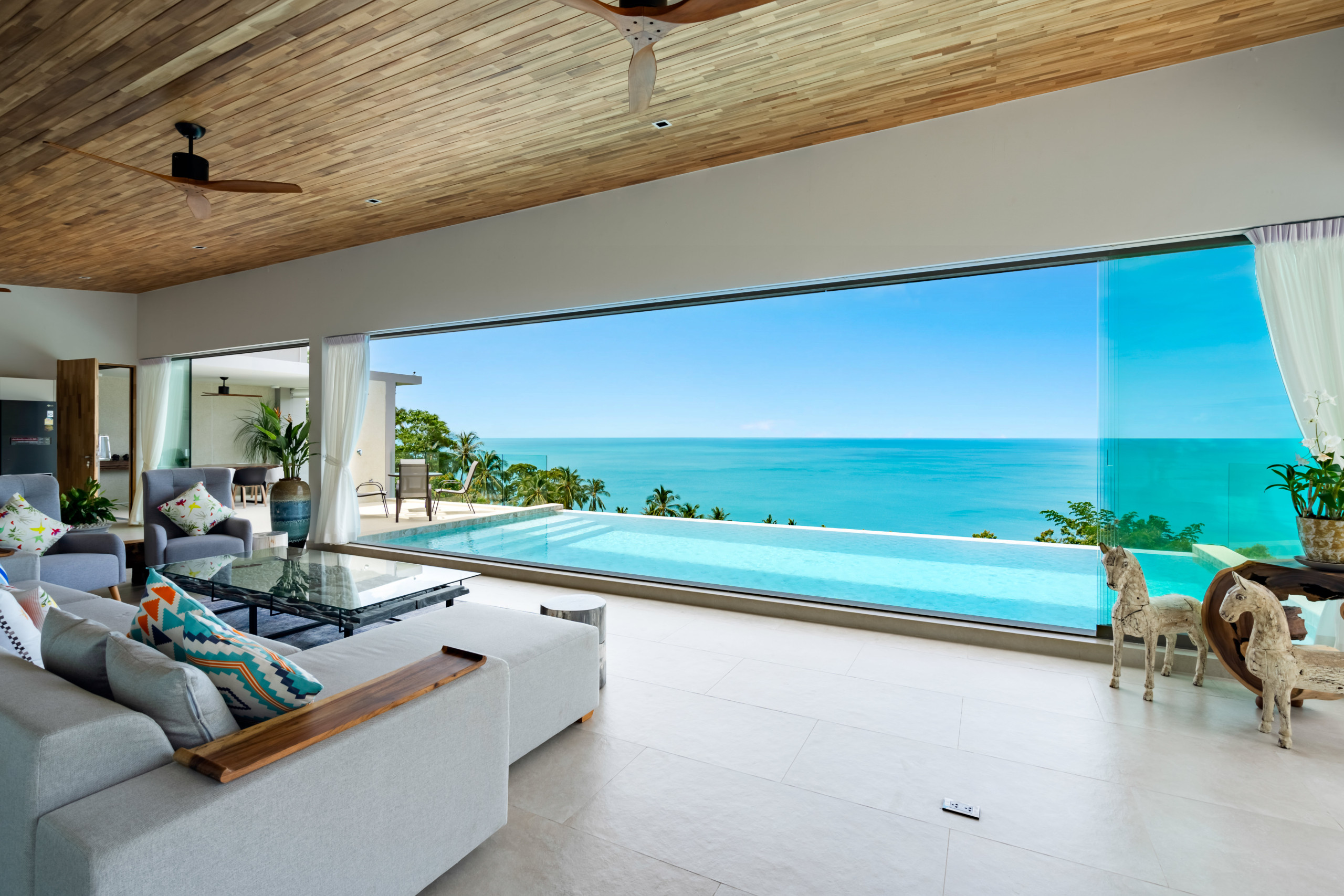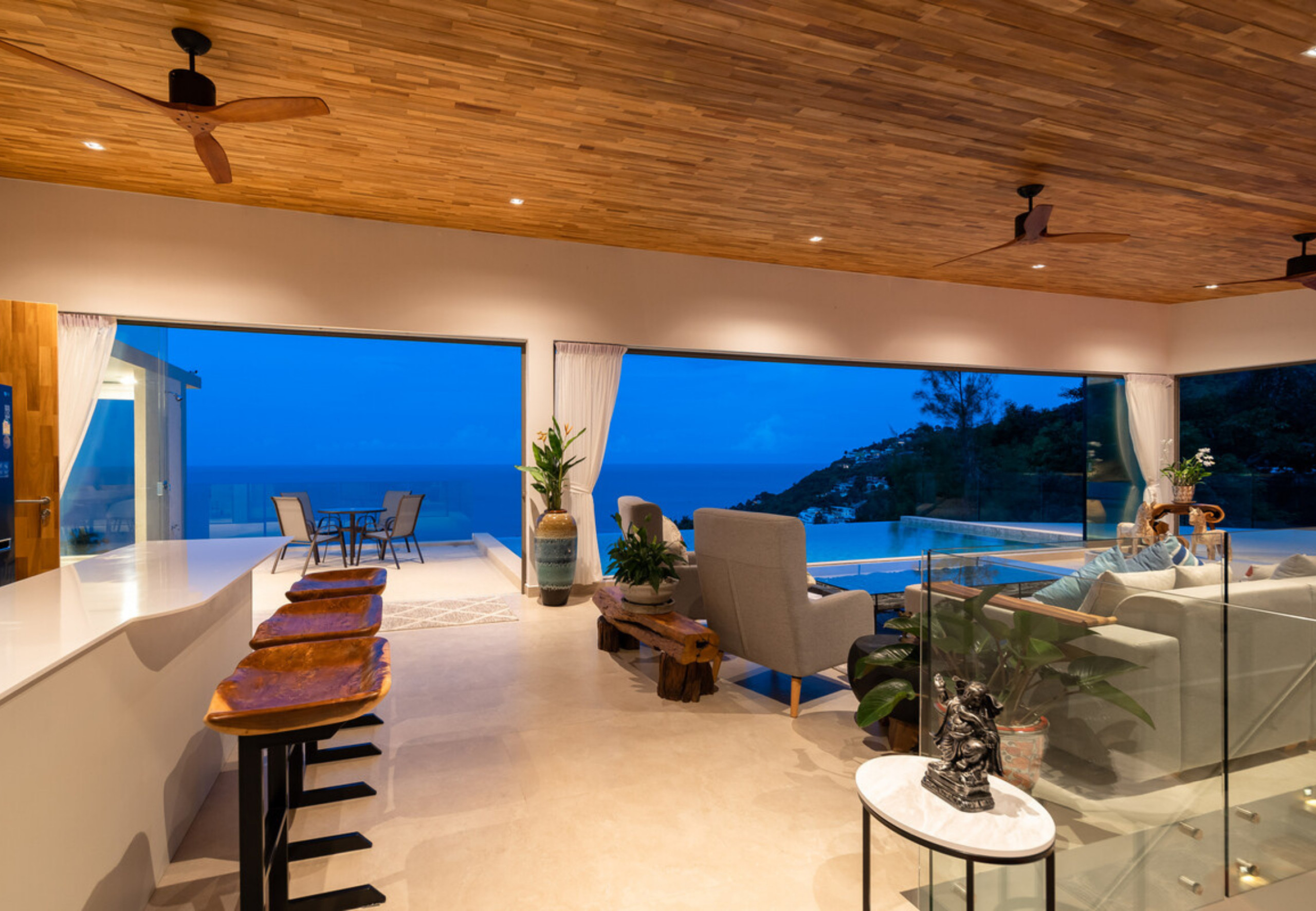 Villa à Ko Samui qui possède 5 chambre(s) et Capacité pour 10 personnes. Logement de 400 m² meublé avec goût et grand, avec vue sur la mer et le jardin. Il est situé dans une zone idéale pour familles zone et dans la zone urbaine. Elle dispose de jardin, mobilier de jardin, 30 m² de terrasse, sèche-linge, accès internet (wifi), sèche-cheveux, balcon, climatisation, piscine privée, parking couvert même bâtiment, 5 ventilateurs, 1 Télévision. La cuisine américaine, à induction, est équipée avec réfrigérateur, micro-ondes, four, congélateur, lave-vaisselle, vaisselle/couverts, ustensiles/cuisine et cuisinière.