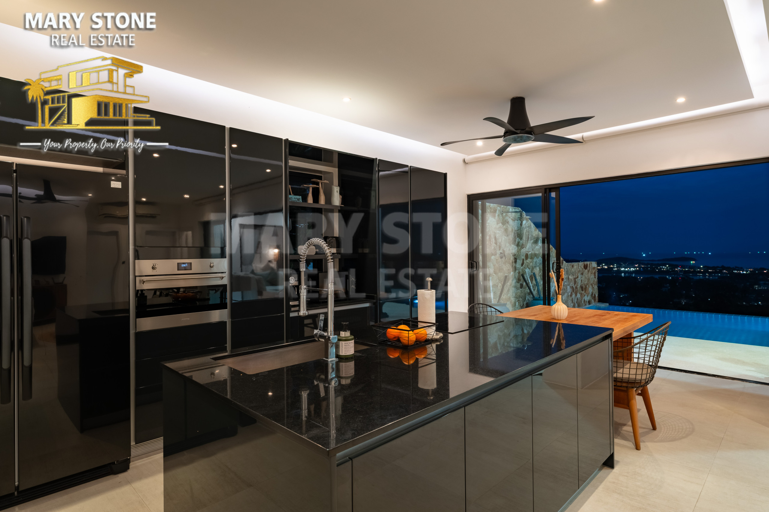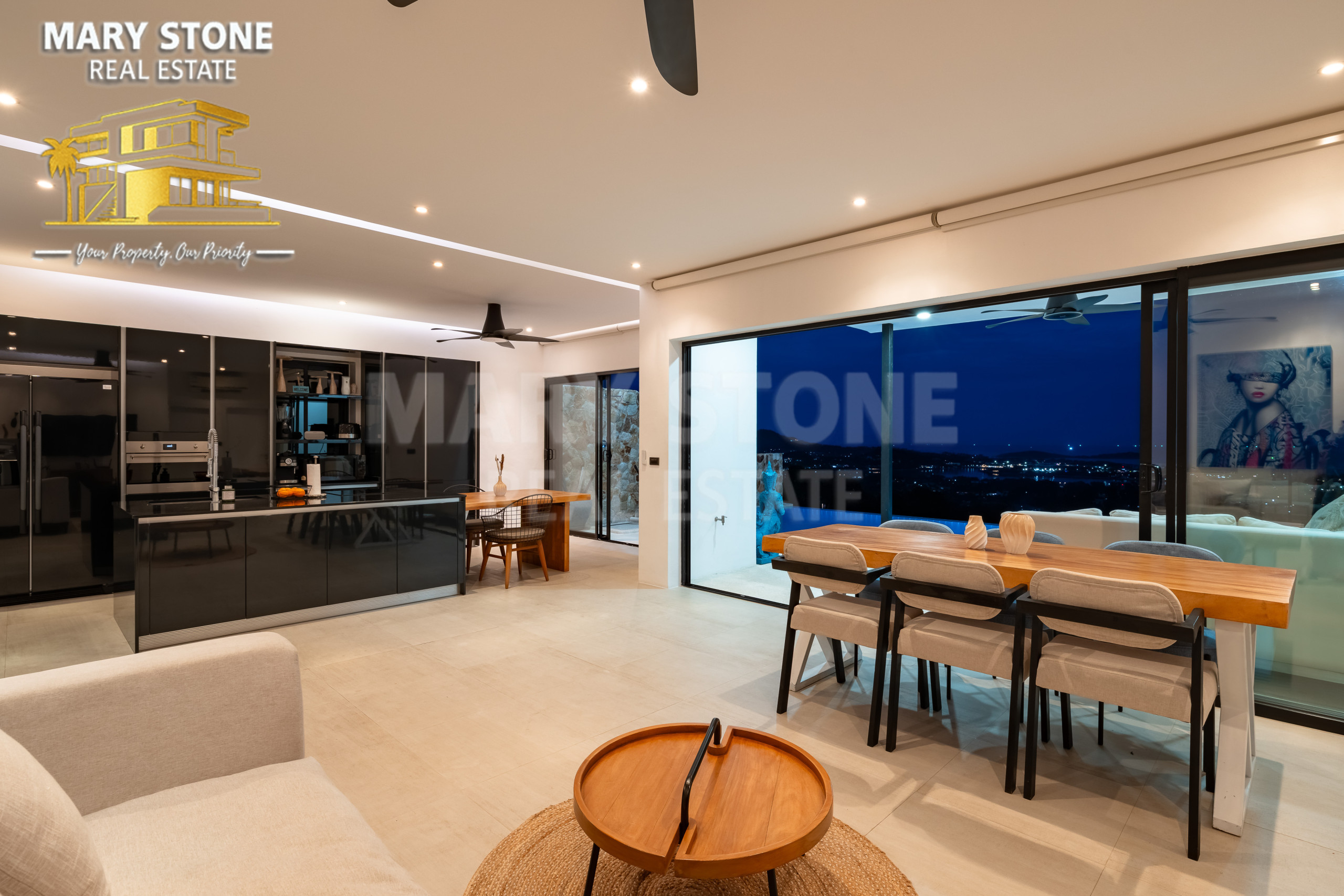 ★ Le rez-de-chaussée vous accueille dans un espace de vie spacieux et élégamment décoré, donnant sur une cuisine ouverte entièrement équipée avec une vue imprenable sur la mer. De larges portes vitrées s'ouvrent complètement pour permettre un accès direct à une terrasse sereine, comprenant une piscine privée et un espace de détente paisible au milieu de la nature. Ce niveau comprend également 2 chambres avec des toilettes pour invités pratiques.