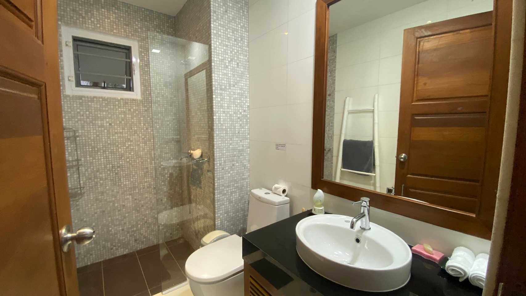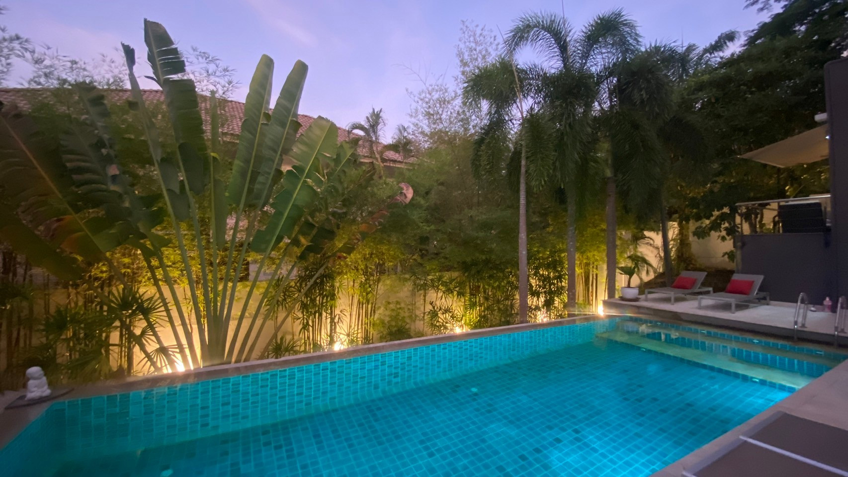 ★ Depuis la terrasse de la grande villa, vous profiterez d'un espace de piscine privée qui comprend des sièges de long canapé et une douche extérieure. La piscine est entourée de diverses grandes plantes et arbres, vous vous sentirez donc frais et paisible tout au long de votre séjour. La villa dispose d'un parking privé gratuit à l'avant de l'entrée avec un toit, la zone peut accueillir 1 voiture et quelques scooters. La route menant à la villa, qui est une rue plate, est facile d'accès en voiture ou en scooter et n'est pas trop pentue. Vous pourrez utiliser la machine à laver dans la buanderie située à l'étage inférieur du rez-de-chaussée.