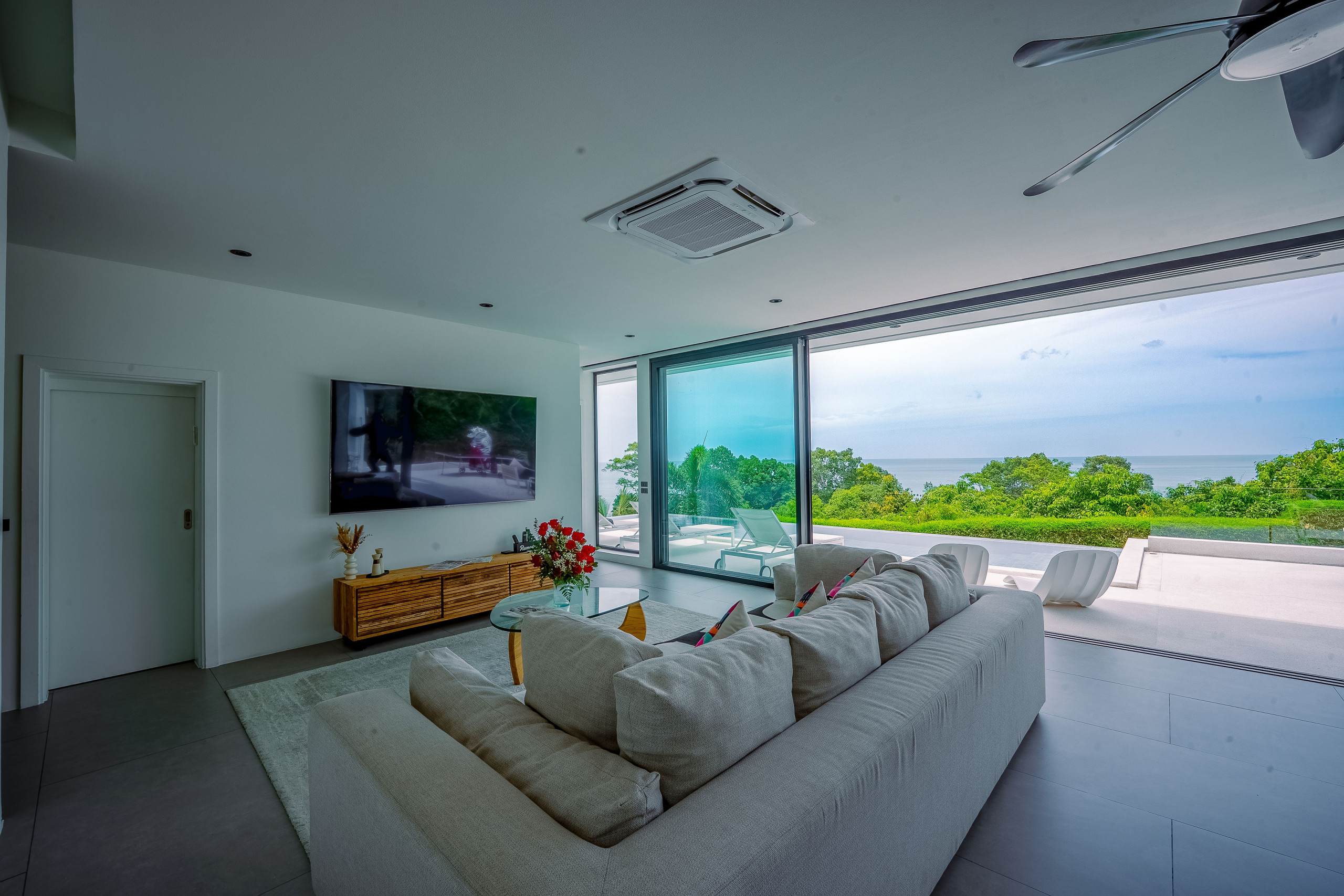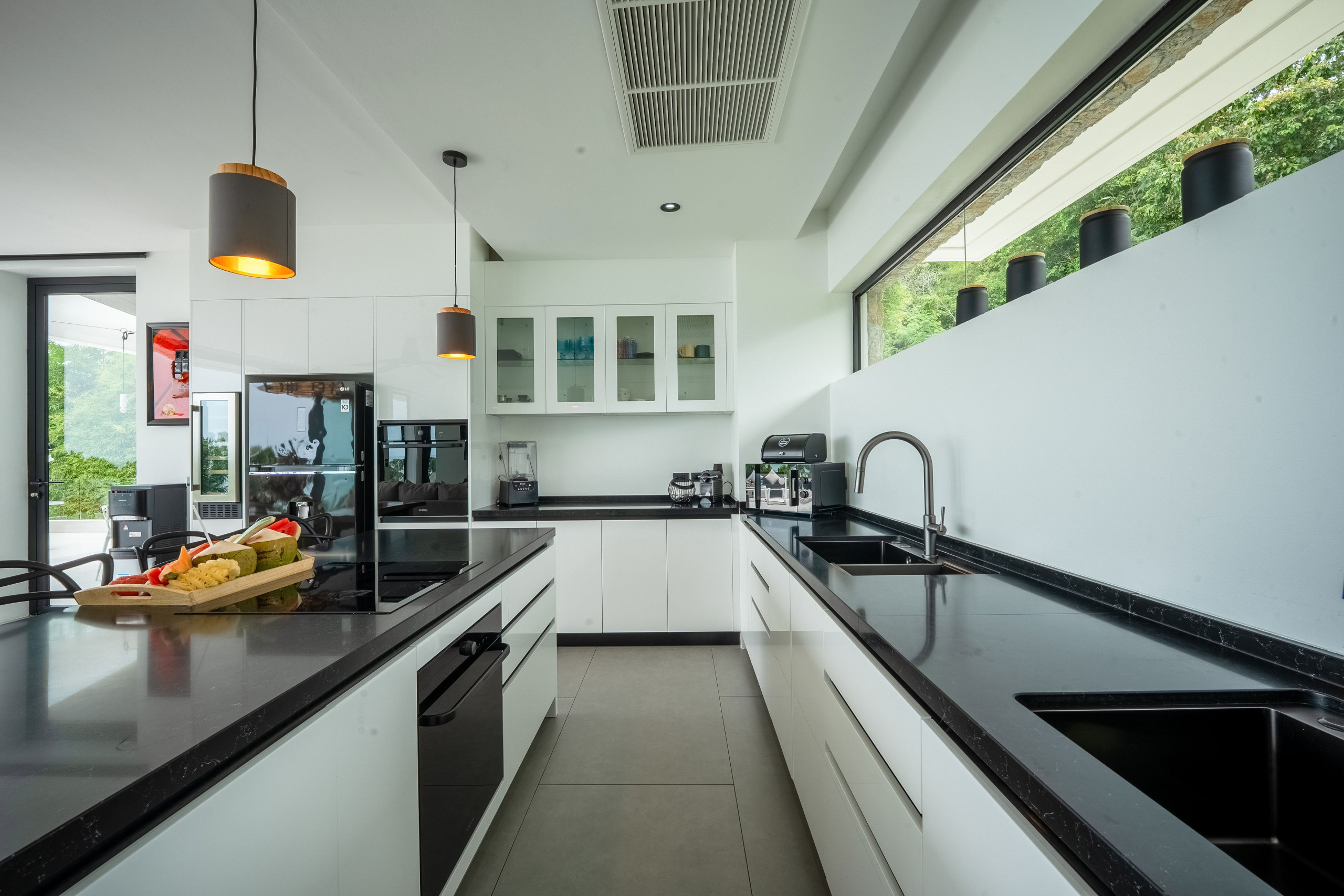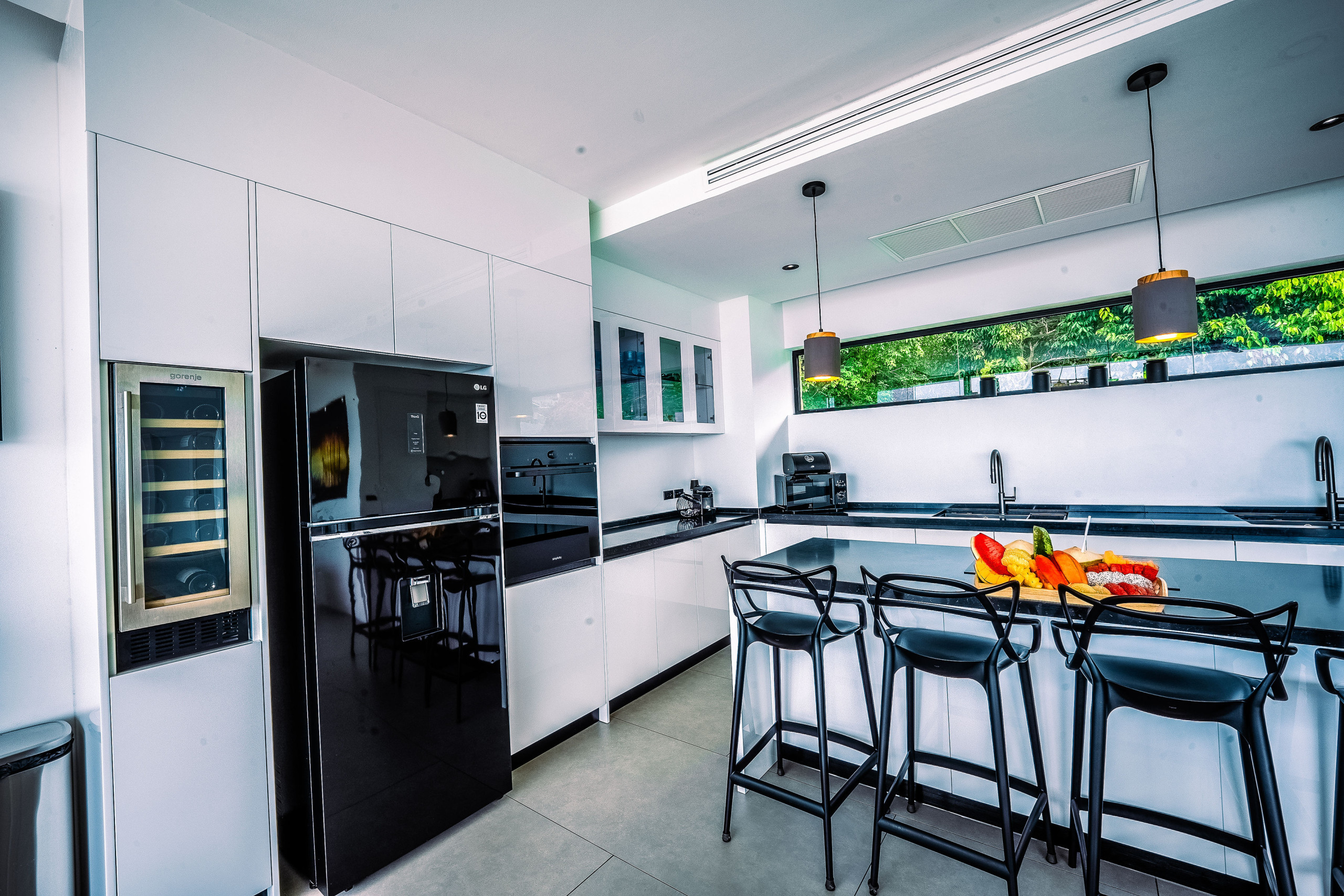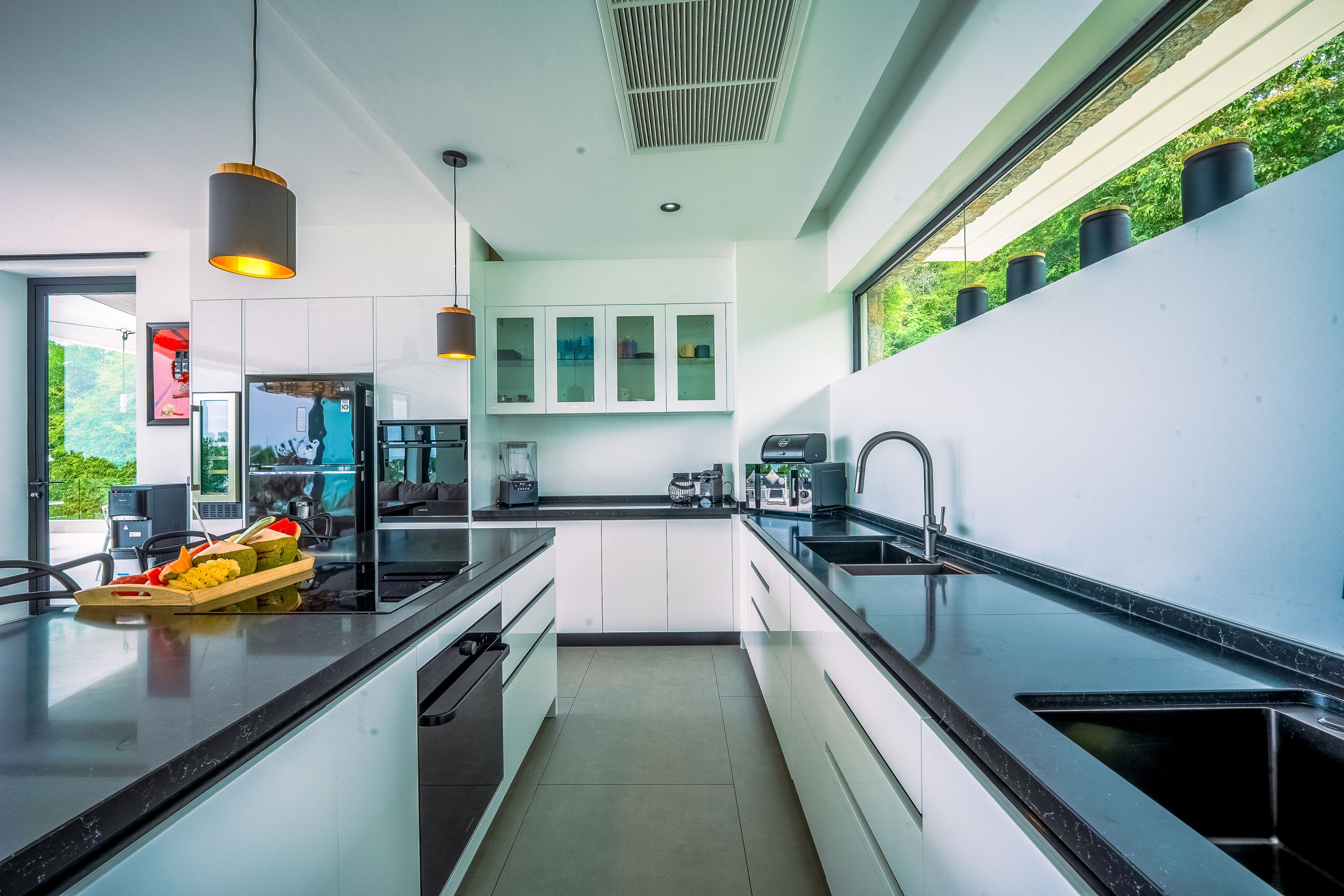 The villa includes a modern and practical kitchen, fitted with everything you need for daily cooking or to welcome a private chef. Meals can be enjoyed indoors or al fresco on the shaded terrace, surrounded by tropical greenery and sea views.