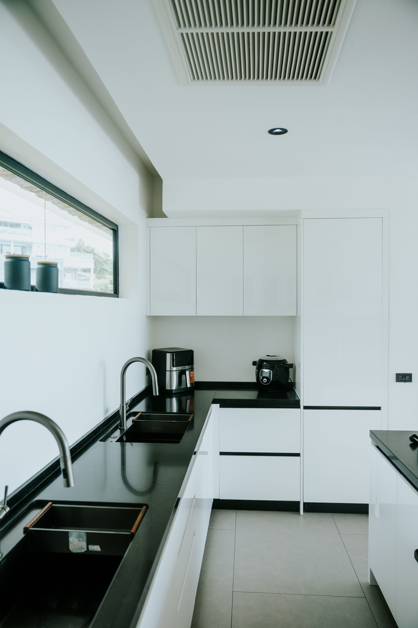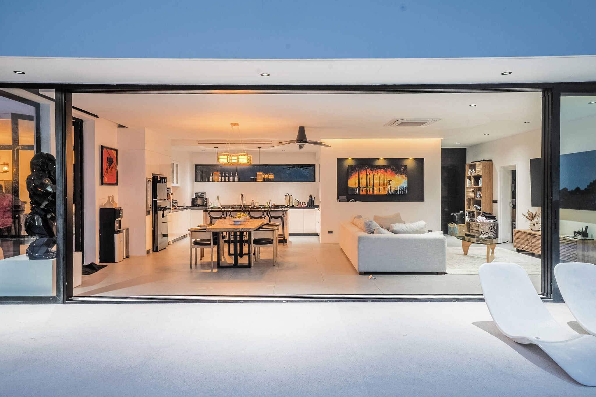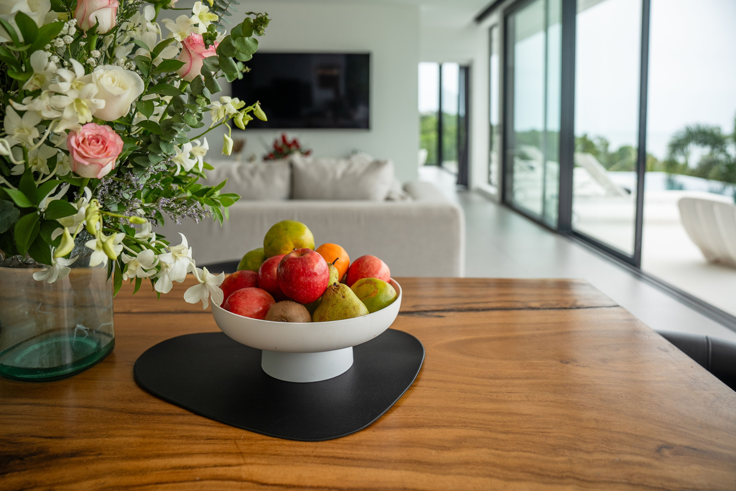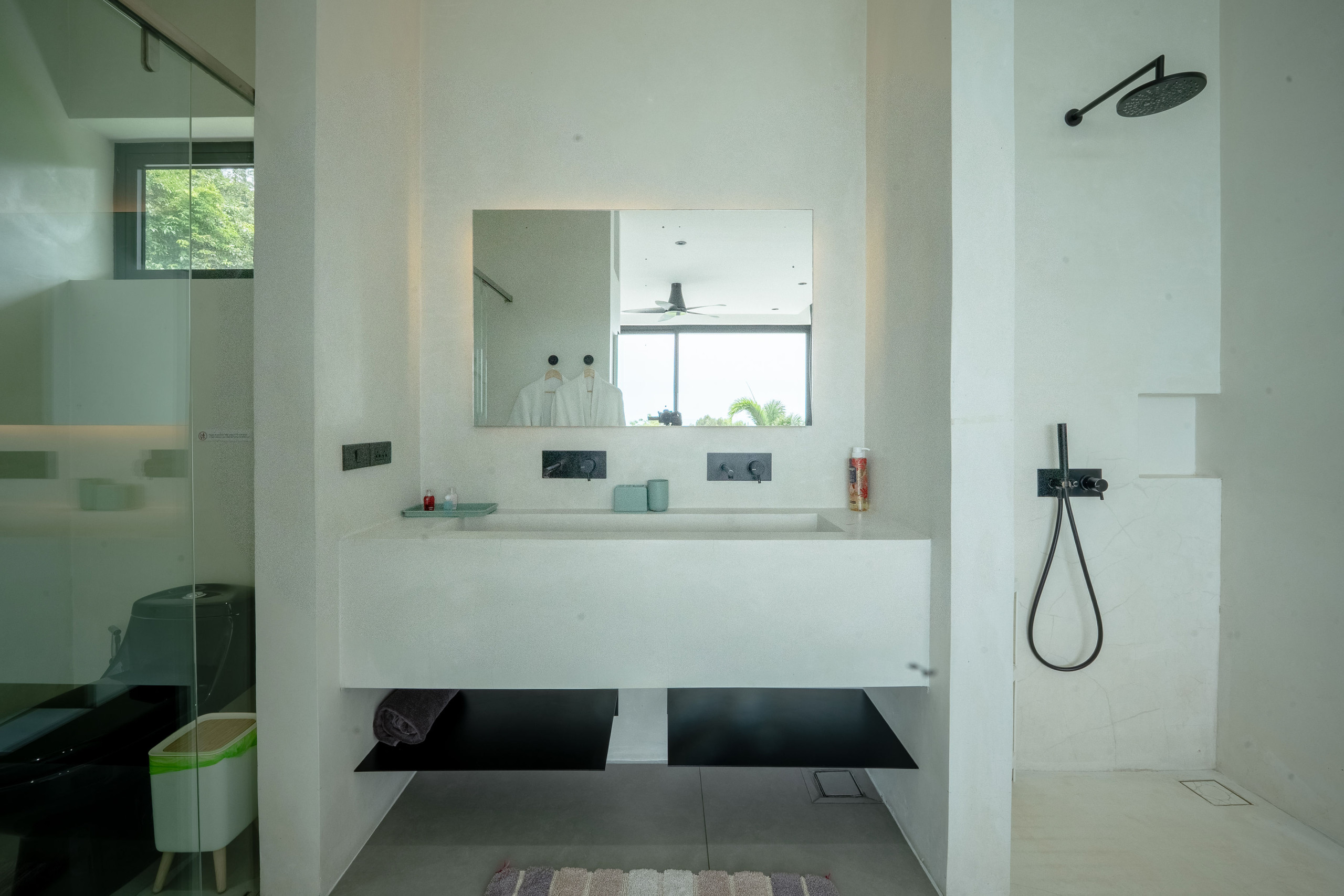The villa includes a modern and practical kitchen, fitted with everything you need for daily cooking or to welcome a private chef. Meals can be enjoyed indoors or al fresco on the shaded terrace, surrounded by tropical greenery and sea views.